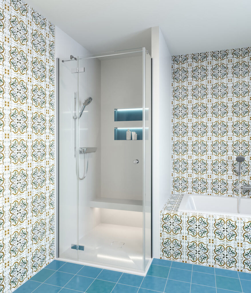 Alle Vorteile von WSP™ in einer Dusche: farblich abgesetzte Regalnischen mit LED-Lichtelementen, fugenlos integrierte Sitzbank mit LED-Lichtelement, Duschflächenvergrösserung, Anti-slip-Beschichtung auf der Duschfläche. Zudem noch ein optisches Highlight.