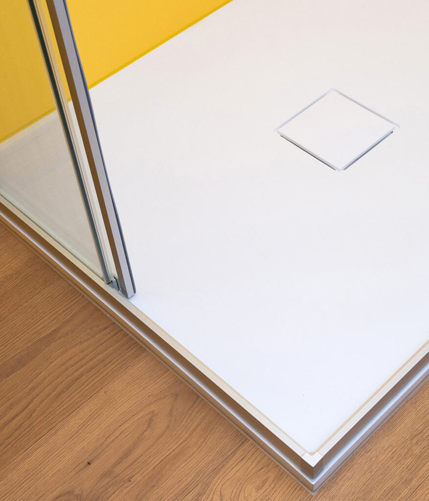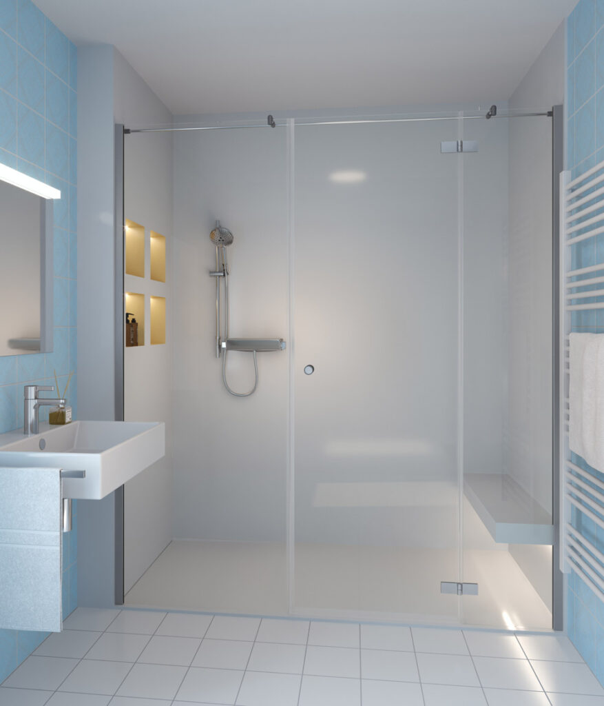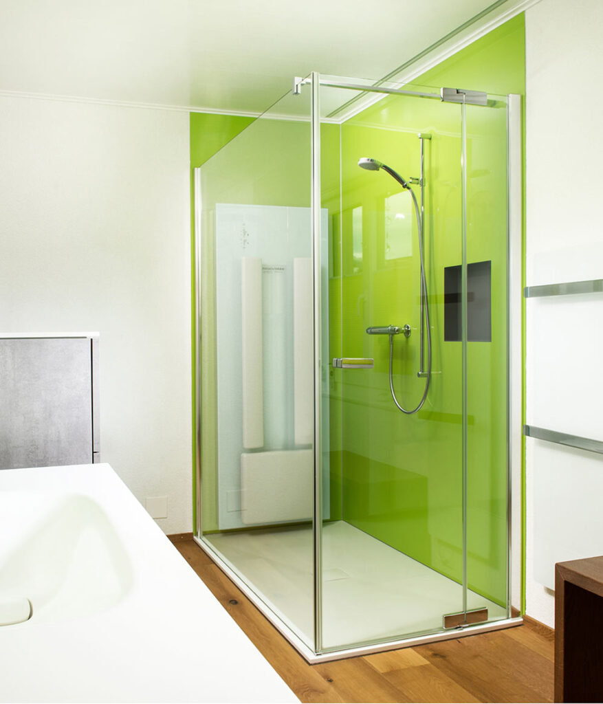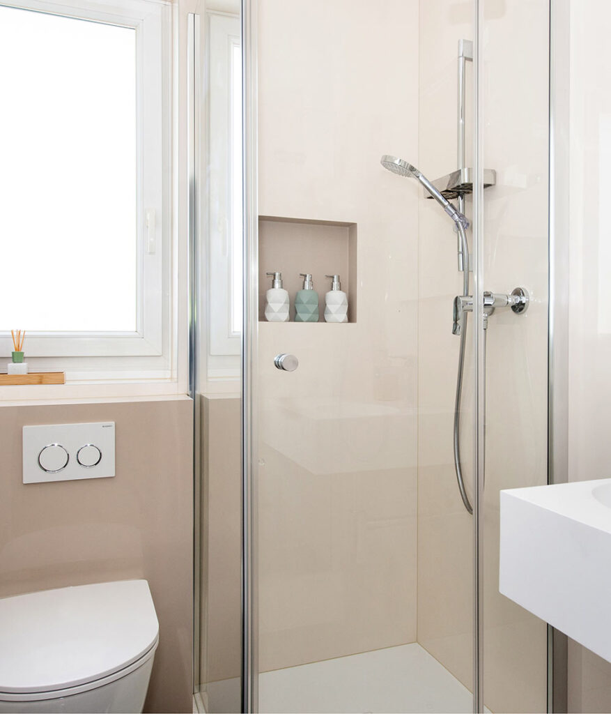 Ein Schwerpunkt unseres Umbaukonzepts ist die Wasserdichtheit. Die Basis dafür legen wir mit durchdachten Details bei den Verbünden von Rückwänden und Duschflächen. Und den einzigartigen, fugenlosen Regalnischen.