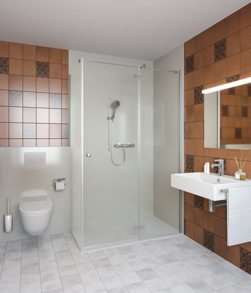Die kleine, alte Dusche wurde durch eine barrierefreie Physiotherm Infrarotdusche ersetzt, welche fugenlos in die WSP™ Rückwände integriert wurde – optimal gegen Verspannungen.